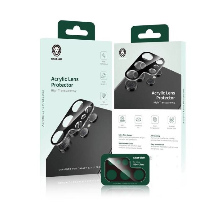 Meet the Green Lion Acrylic Lens Protector, designed especially for the Samsung S24 Plus. This protector has a 9H hardness grade, which guarantees excellent anti-scratch qualities. Thanks to its anti-fingerprint and anti-reflective characteristics, you can say goodbye to annoying fingerprints and distracting reflections. It seamlessly fits your device and blends in, boosting protection without detracting from the look of your gadget. Green Lion’s accuracy and quality will improve the protection of your Samsung S24 Plus lenses.
